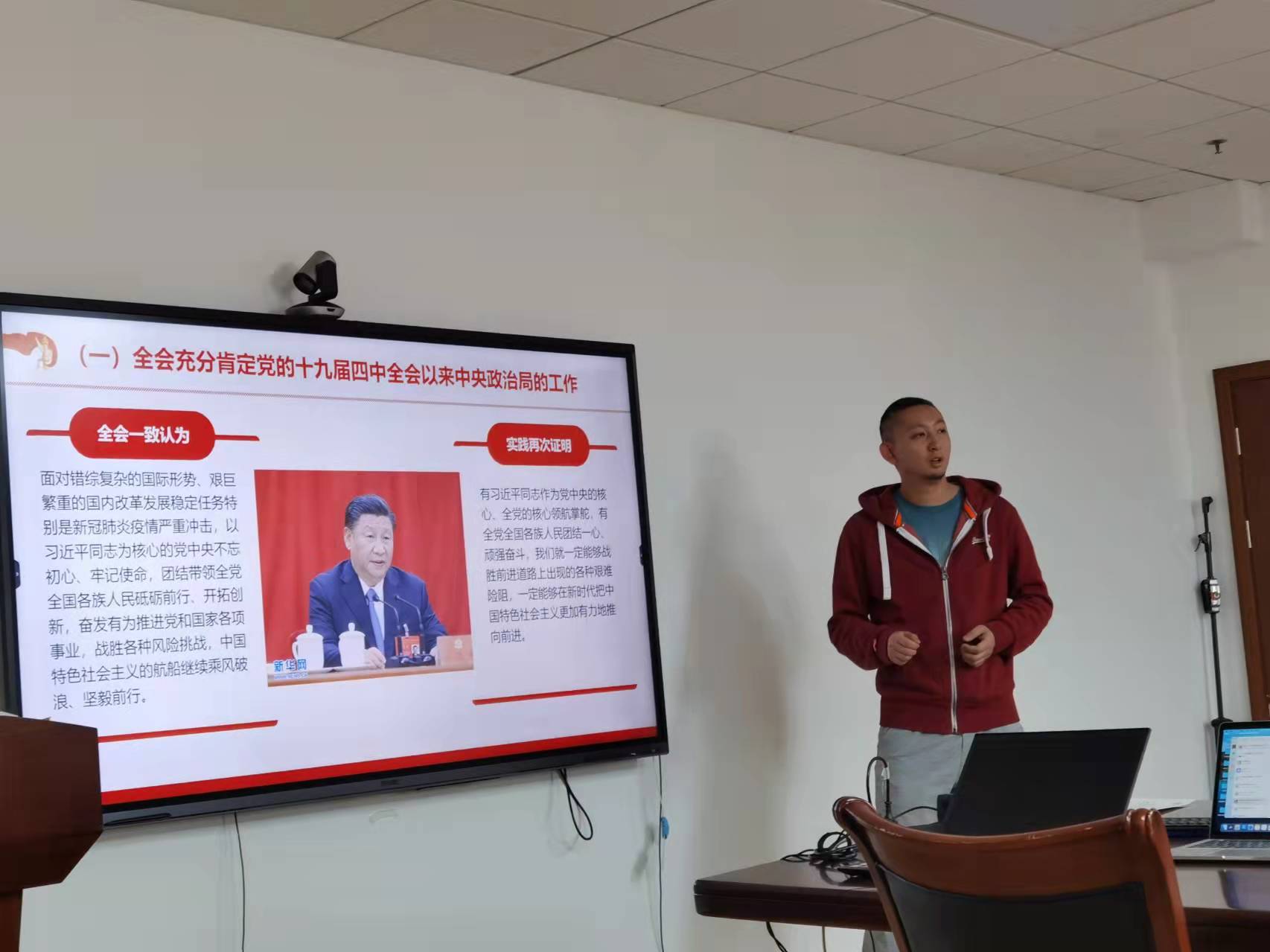 随后,支部书记张亮带领支部党员回顾十九届五中全会要点,引导党员做好迎接党的十九届六中全会召开的准备活动。张老师从五中全会召开背景、会议事项和会议公报解读及中央政治局明确的六中全会主要议程四个方面进行讲解,指出五中全会是在我国将进入新发展阶段、实现中华民族伟大复兴正处在关键时期召开的一次具有全局性、历史性意义的重要会议而六中全会则将通过总结我党过去百年的重大成就和历史经验问题为第二个百年奋斗奠定坚实的基础。带领大家进行会议公报解读时,张老师将其与教师党员的科研相结合,建议教师党员要主动通过学习强国app等进行理论知识学习,在科研工作中认真贯彻落实十九届五中全会精神。十九届六中全会将于11月8日至11日在北京召开,张老师通过10月18日中共中央政治局召开的会议内容,带领党员同志们回顾了在我党发展历史上两次著名的、对我党发展产生重要影响的“历史决议”,并强调党支部成员应认真关注、学习此次提出的《中共中央关于党的百年奋斗重大成就和历史经验的决议》文件,做好迎接六中全会召开的准备。