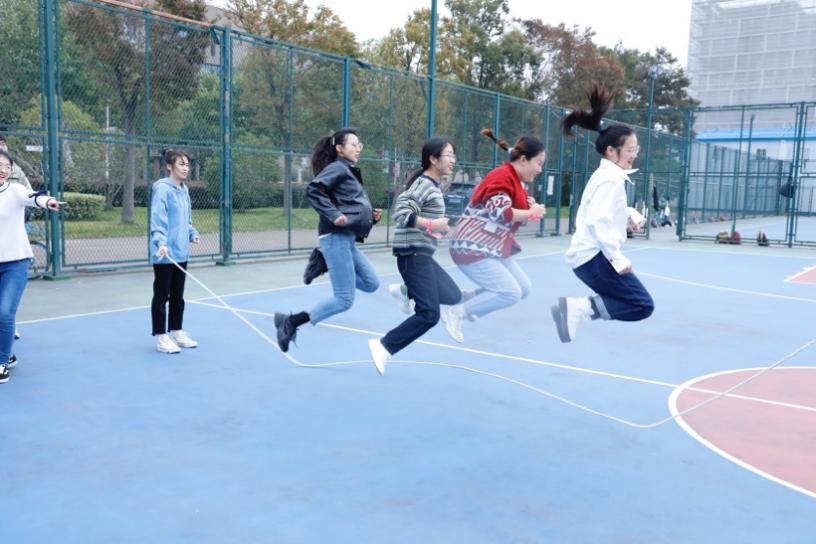 在“跳大绳”项目中,每组六名队员在两分钟内排队依次跳过大绳,以跳跃成功次数多少排出名次,其中粉队坚持不懈,以出色的表现获得了第一。