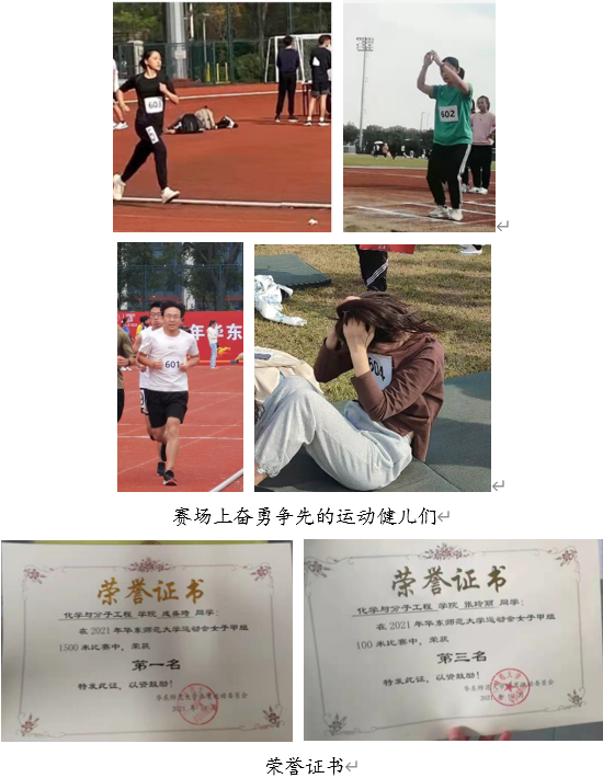 在本次运动会中,化学院共有四名健儿参加了男子3000米长跑、男子1000米长跑、女子1500米长跑、女子100米短跑、女子立定跳远、女子仰卧起坐等多项比赛。运动员们在赛前开展了刻苦的训练,为比赛做好了充足的准备,在比赛中,他们奋勇争先、顽强拼搏、锐意进取,取得了优异的成绩,为化学院赢得了荣誉。其中成盛琦同学荣获女子1500米跑第一名,张玲丽同学获女子100米短跑第三名的好成绩。