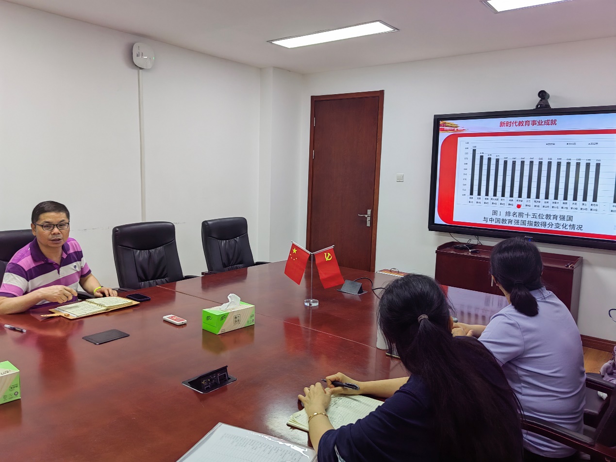 “教育兴则国家兴,教育强则国家强”。党的十九大作出了优先发展教育事业、加快教育现代化、建设教育强国的战略部署。党中央、国务院发布了《中国教育现代2035》,确立了发展奋斗目标:到2035年,总体实现教育现代化,迈入教育强国行列。党的二十大对“加快建设教育强国、科技强国、人才强国”作出全面系统部署,为到2035年建成教育强国指明了新的前进方向。我们都是教育现代化的亲历者、建设者,要紧紧围绕教育强国目标不懈努力奋斗。会党委委员纷纷表示要认真学习领会习近平总书记的重要讲话精神,把思想和行动统一到习近平总书记重要讲话精神上来,要深刻理解把握我国建设教育强国的战略定位、本质特征、政治优势、主攻方向和重点任务。立足本职工作,坚持不懈用习近平新时代中国特色社会主义思想铸魂育人,树立“躬耕教坛、强国有我”的志向和抱负,全面提升育人本领,以创新为动力,全面加强人才培养质量,切实提升教育服务高质量发展能力,为加快建设教育强国,发挥教育在全面建设社会主义现代化国家中的基础性、战略性支撑作用贡献力量。