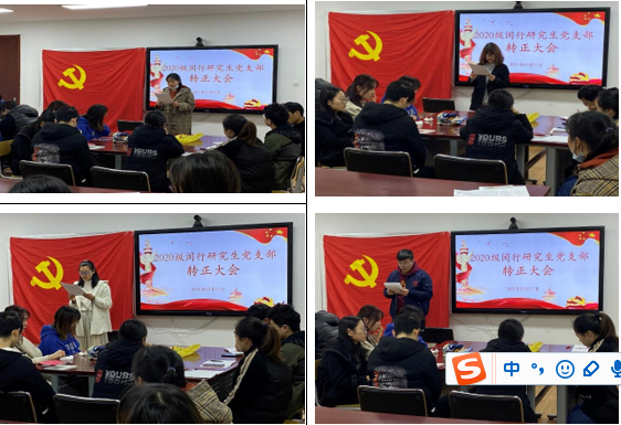 王婷婷等四位同志首先对自己在转正党员期间的情况进行汇报,随后由各位培养联系人针对培养对象在预备期内的表现作评价,而后支部党员同志对四位转正党员的政治、思想、生活方面进行了批评与评价,采取无记名投票方式进行表决,投票结果为四位预备党员认真履行党员义务、具备党员条件,支部大会讨论、表决王婷婷等四位同志按期转为正式党员。